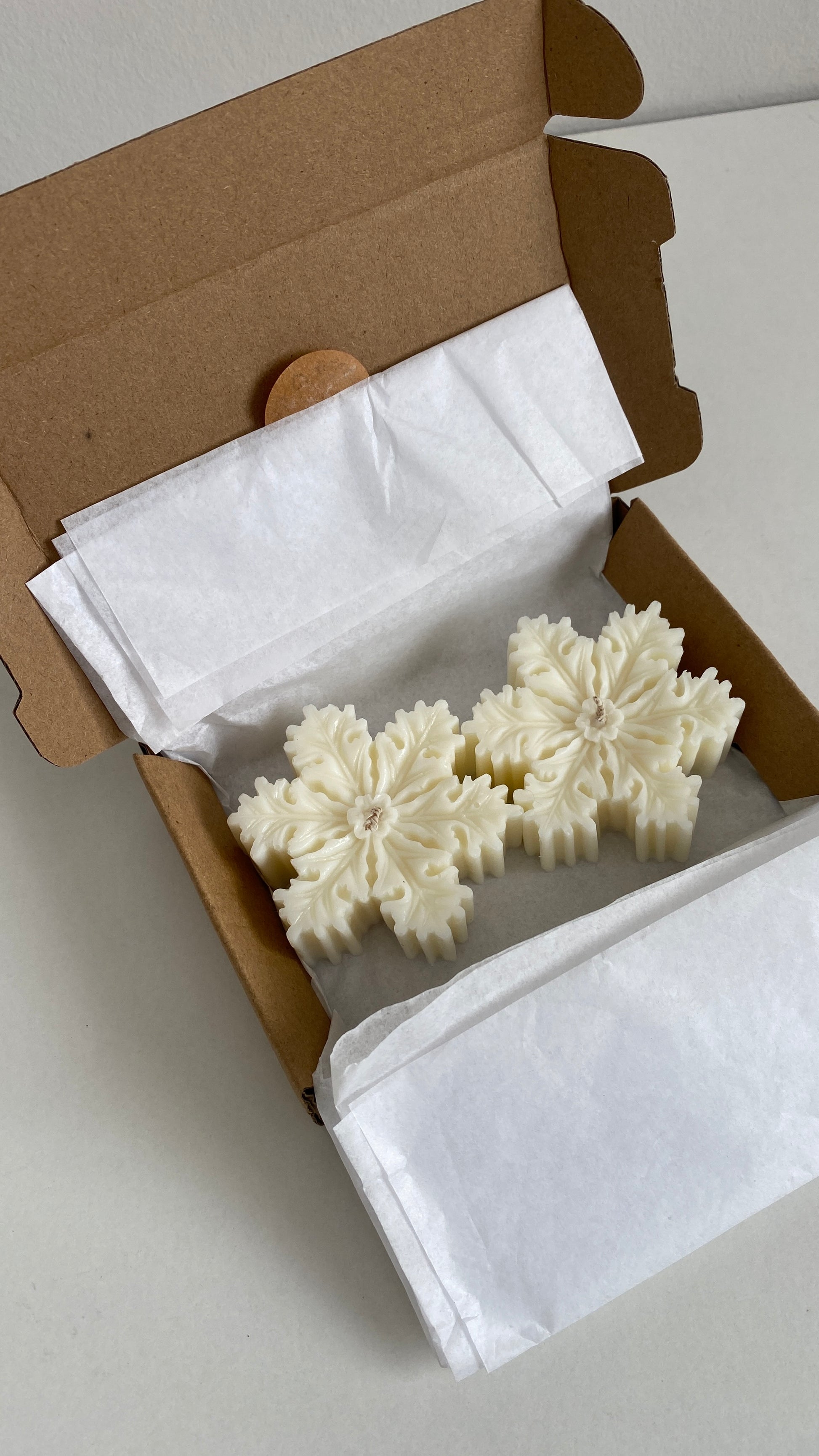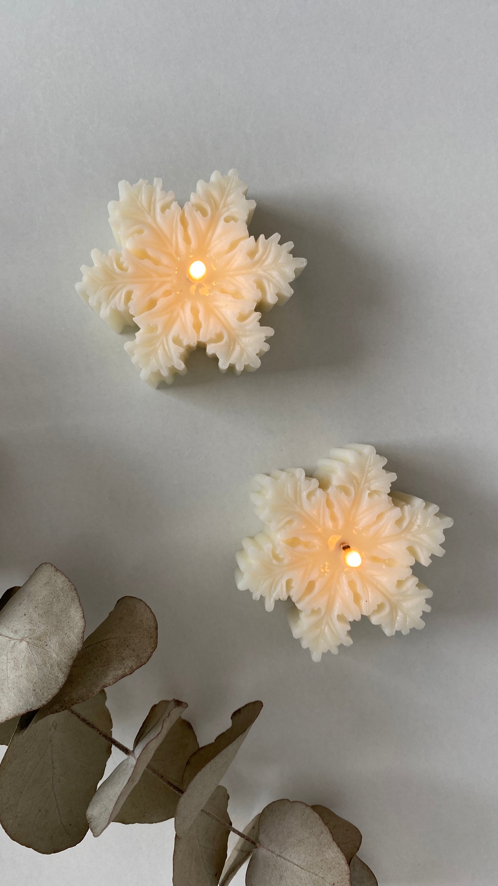 Este set incluye dos velas con forma de copos de nieve, cuidadosamente diseñadas con gran detalle para capturar la delicadeza y la elegancia de la temporada.