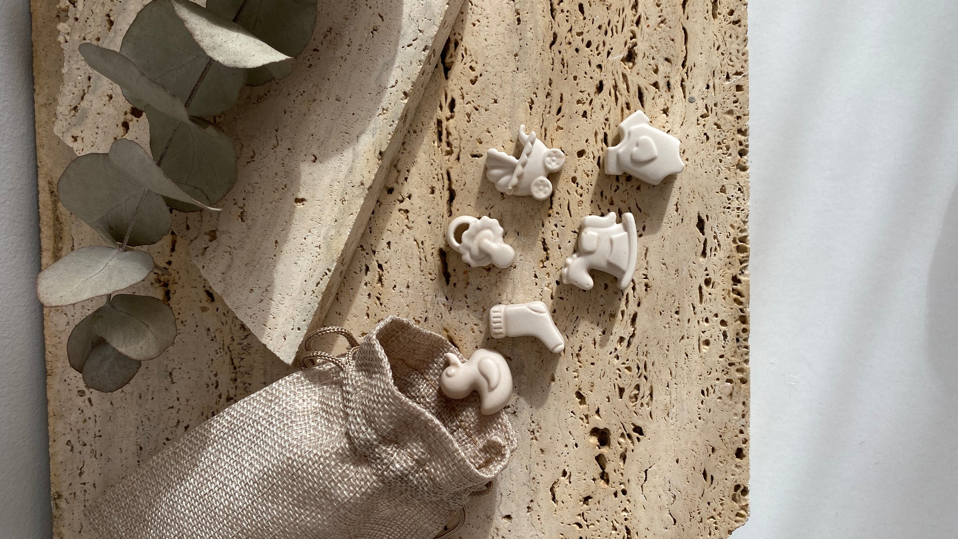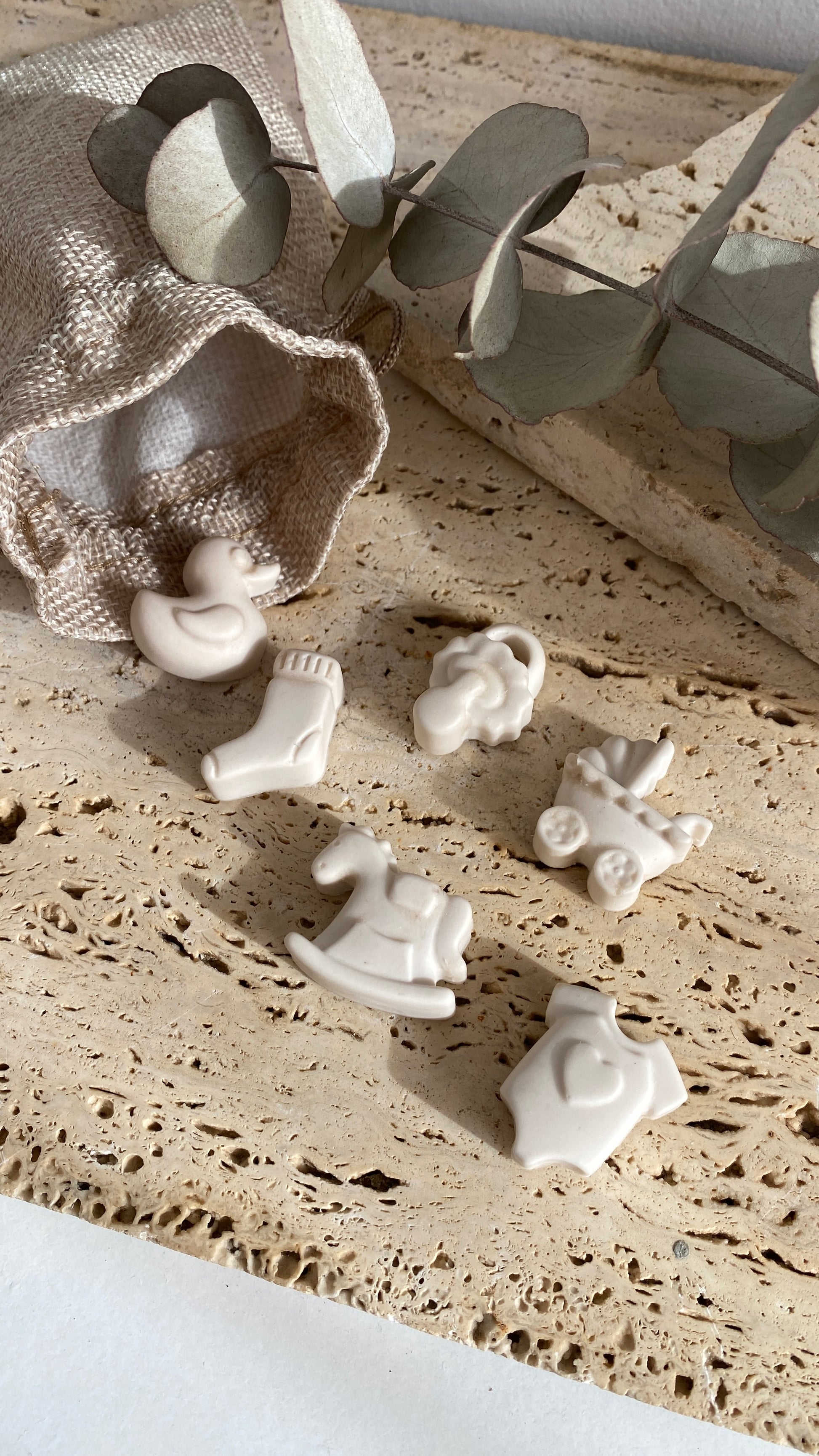 Este pack de 6 imanes minimalistas con motivos de bebé (como biberón, chupete o body) es ideal para estimular el juego simbólico en los más pequeños.