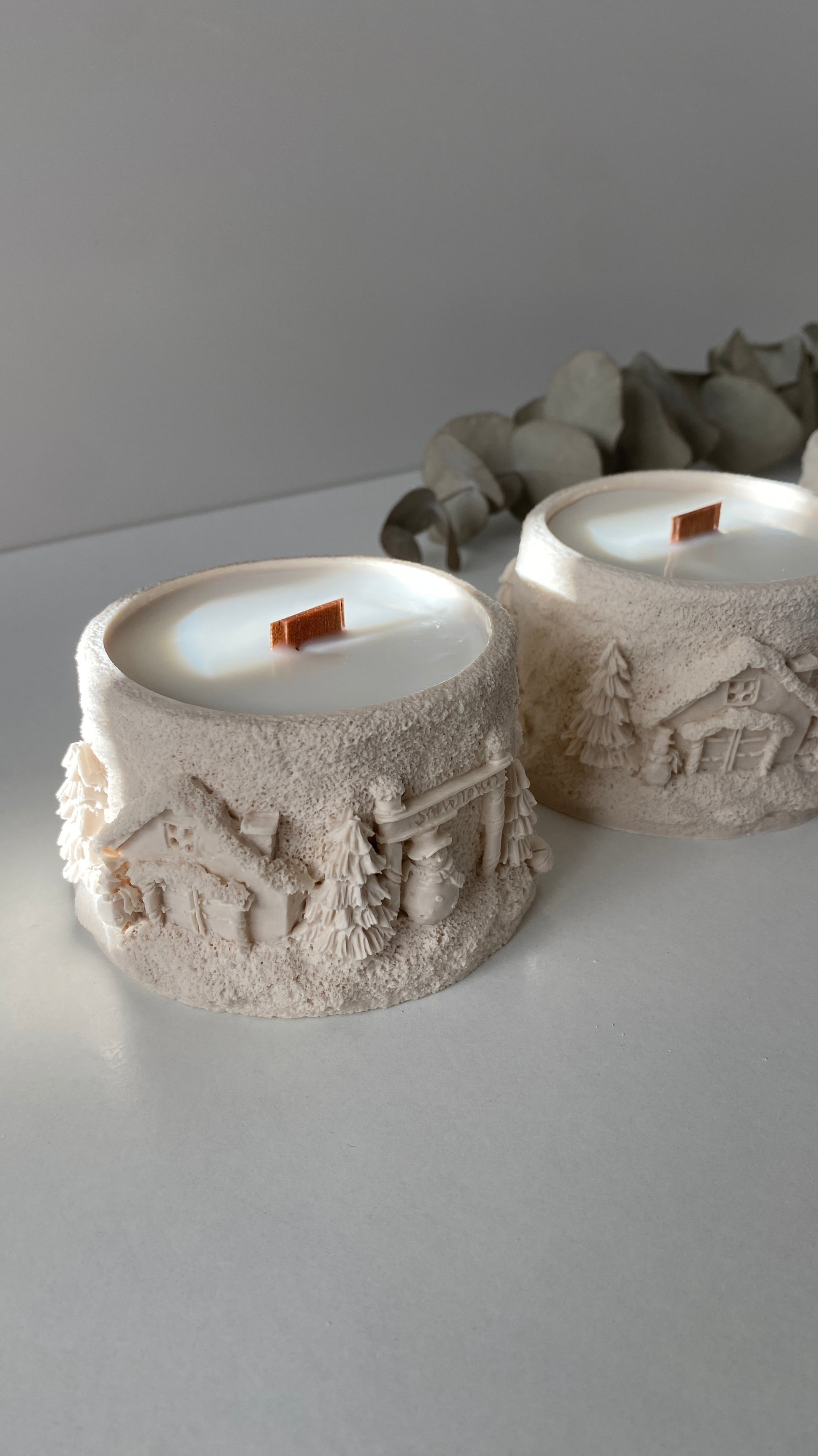 Nuestro recipiente exclusivo, inspirado en un encantador pueblito invernal, alberga una vela única que combina pino, eucalipto y cedro, envolviendo tu espacio en un aroma fresco, sereno y lleno de magia.